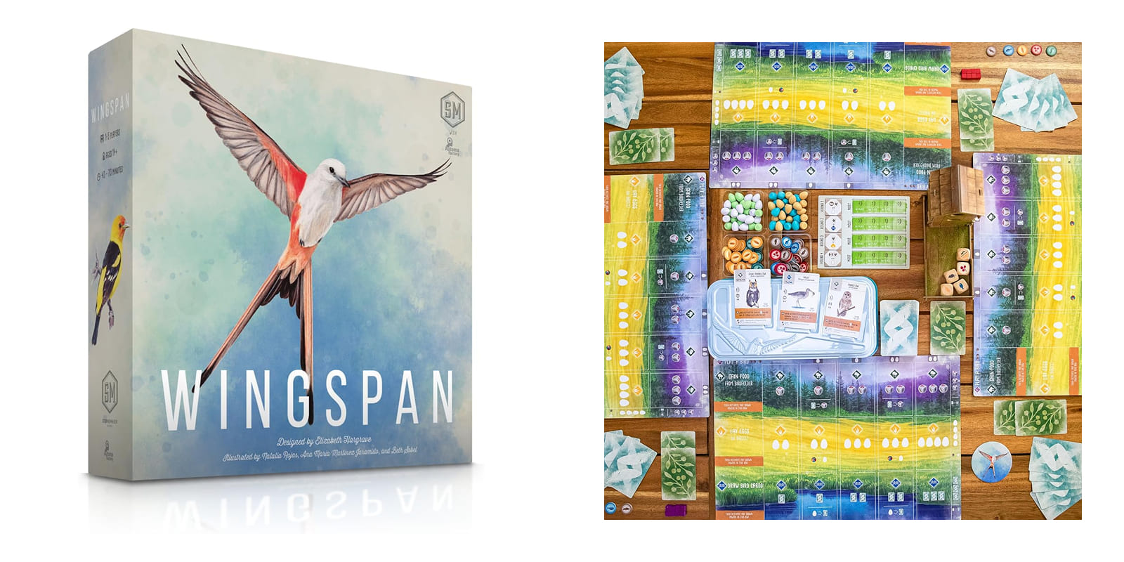 Elizabeth Hargrave’s award-winning Wingspan is a card-driven engine builder where players attract birds to their wildlife preserves. Winner of the 2019 Kennerspiel des Jahres, it’s known for its lavish production — illustrated cards, custom dice, and a birdfeeder dice tower — making it a hit with both casual players and hardcore strategists.