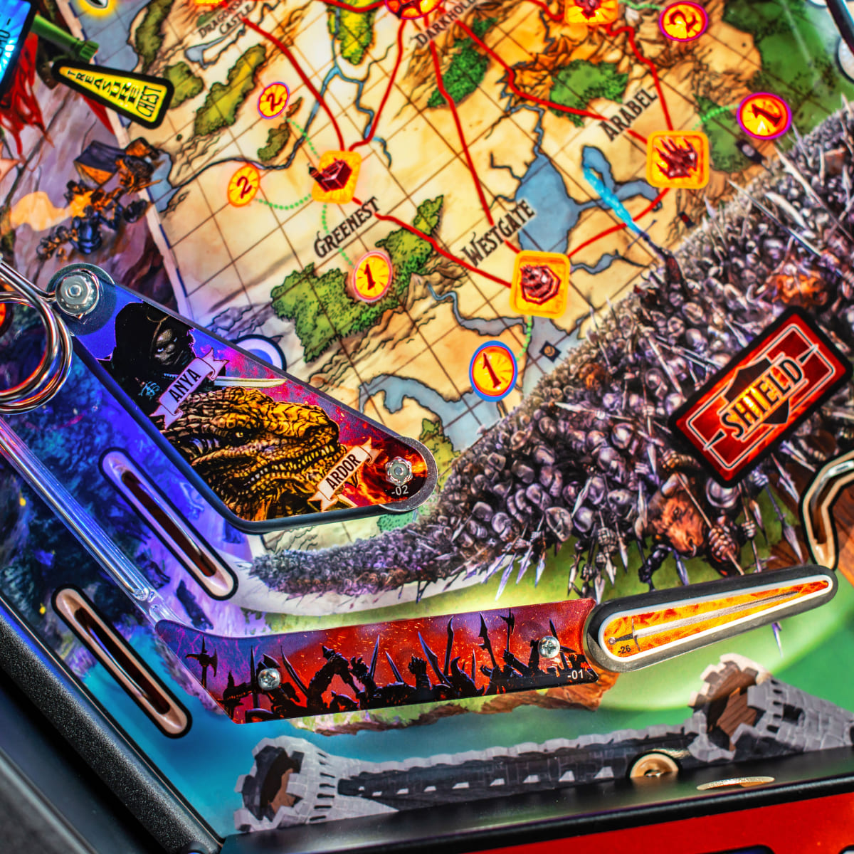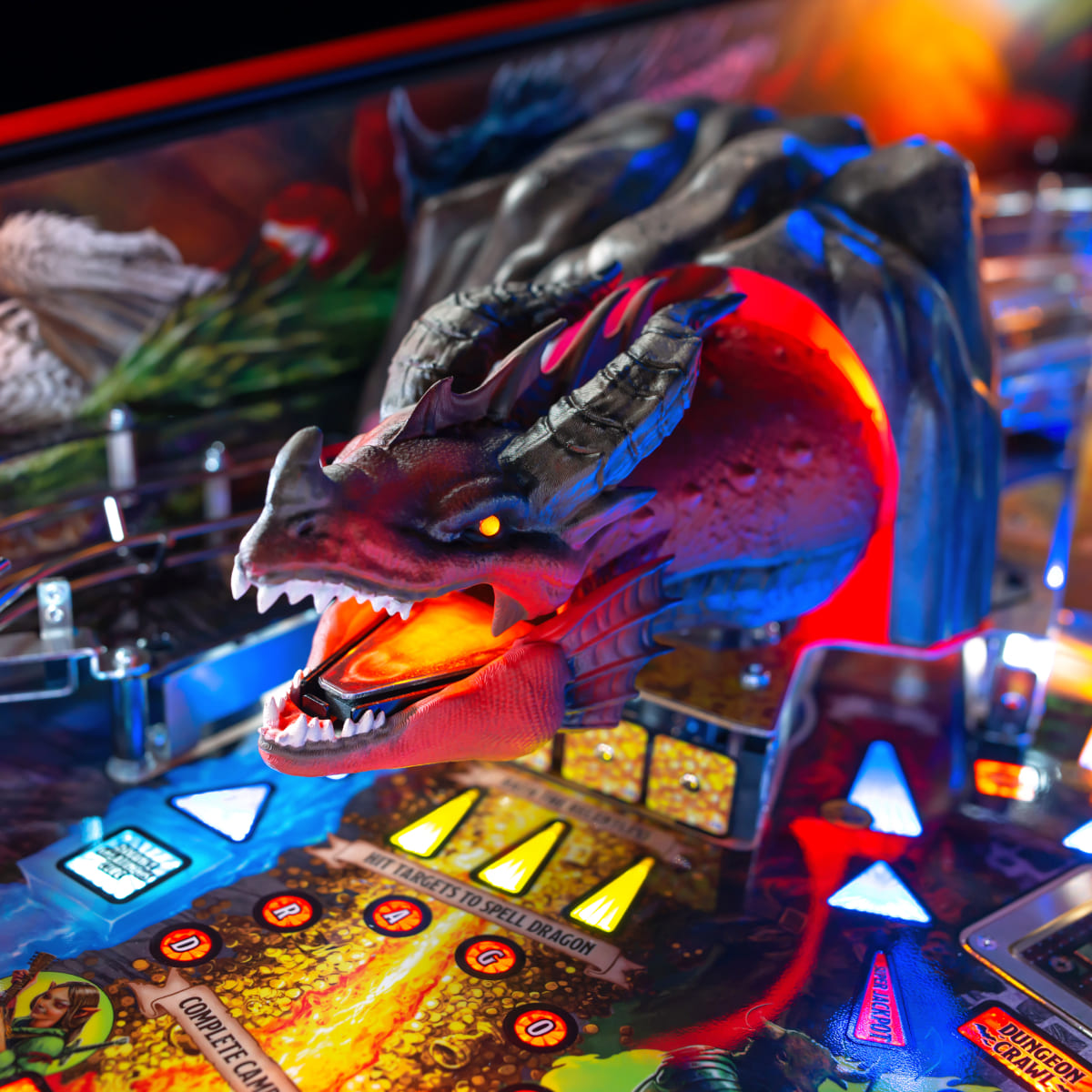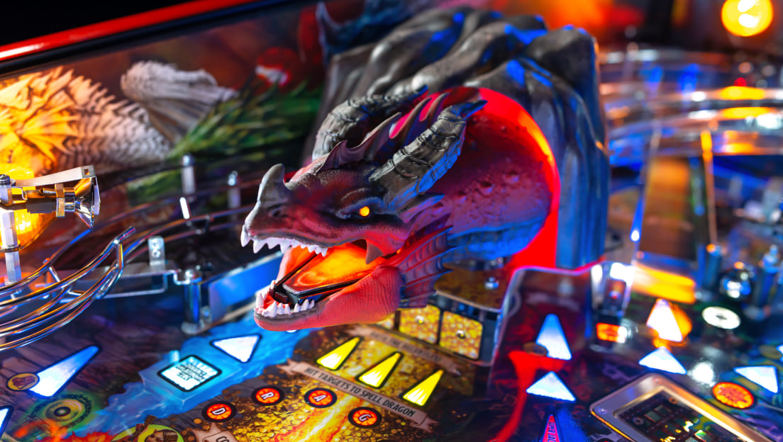 The game features Rath the Relentless, a red dragon with multi-axis motion, omnidirectional impact sensing, and interactive fire-breathing effects, making it the most advanced animatronic mech in pinball history. This cutting-edge technology creates a thrilling and dynamic gaming experience.