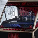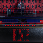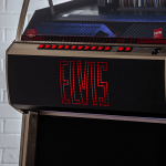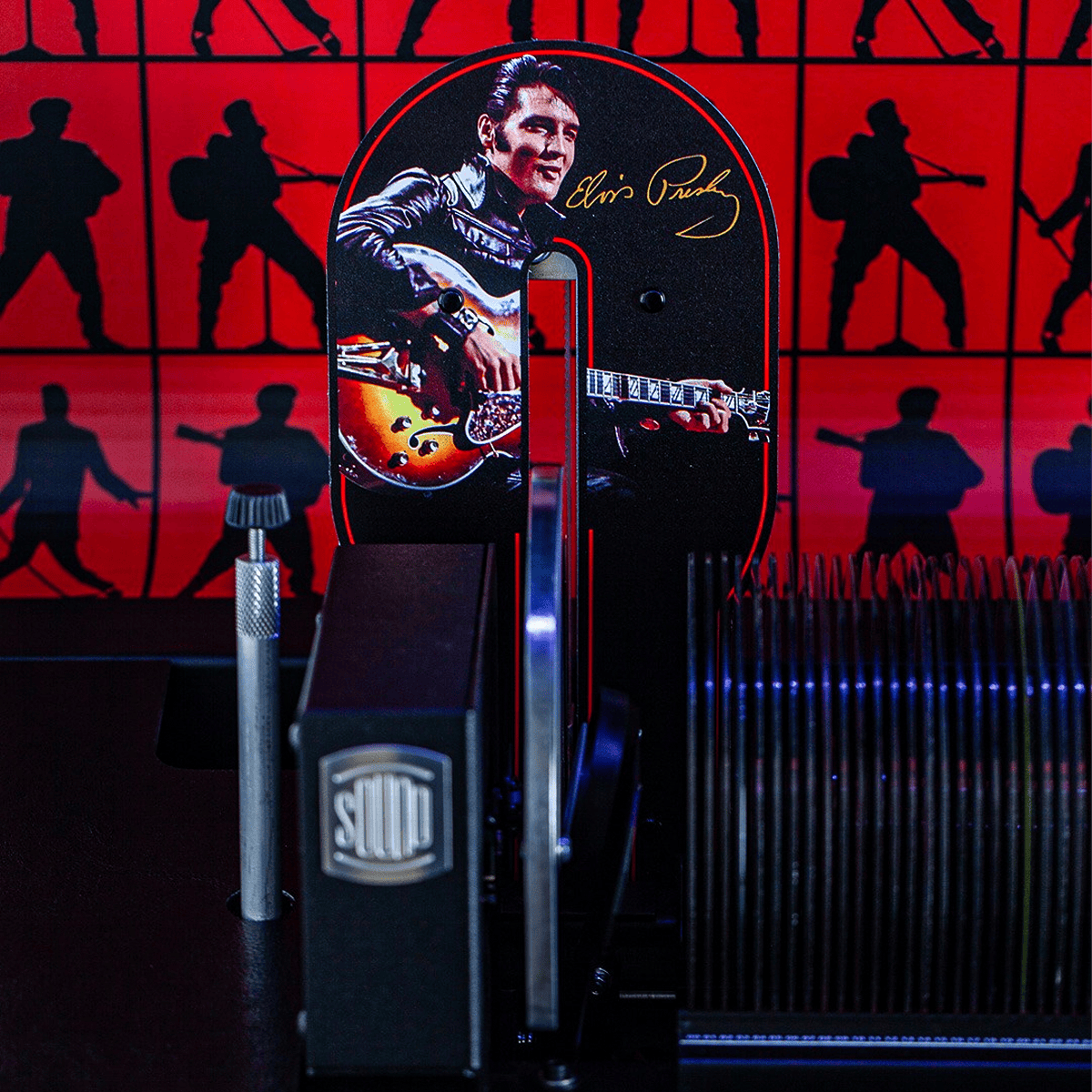 Every detail reflects Elvis’s 1968 Comeback Special: the backlit “ELVIS” logo, red-and-black silhouettes, and a vintage-style leatherette cabinet mirroring Elvis’s look during the concert.