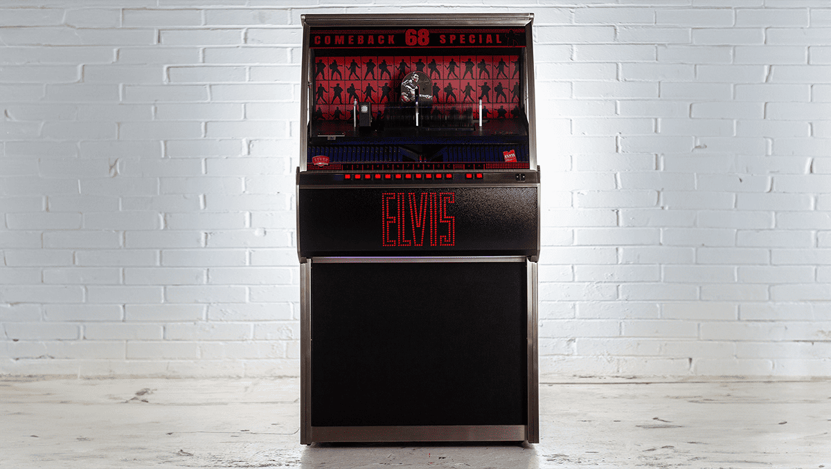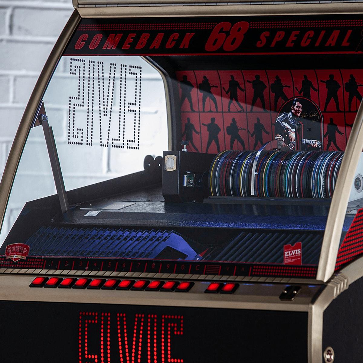 The Elvis Presley ‘68 Comeback Special Jukebox is designed and manufactured under license by Sound Leisure in Leeds, England, in collaboration with Richard Singh and Elvis Presley Enterprises.