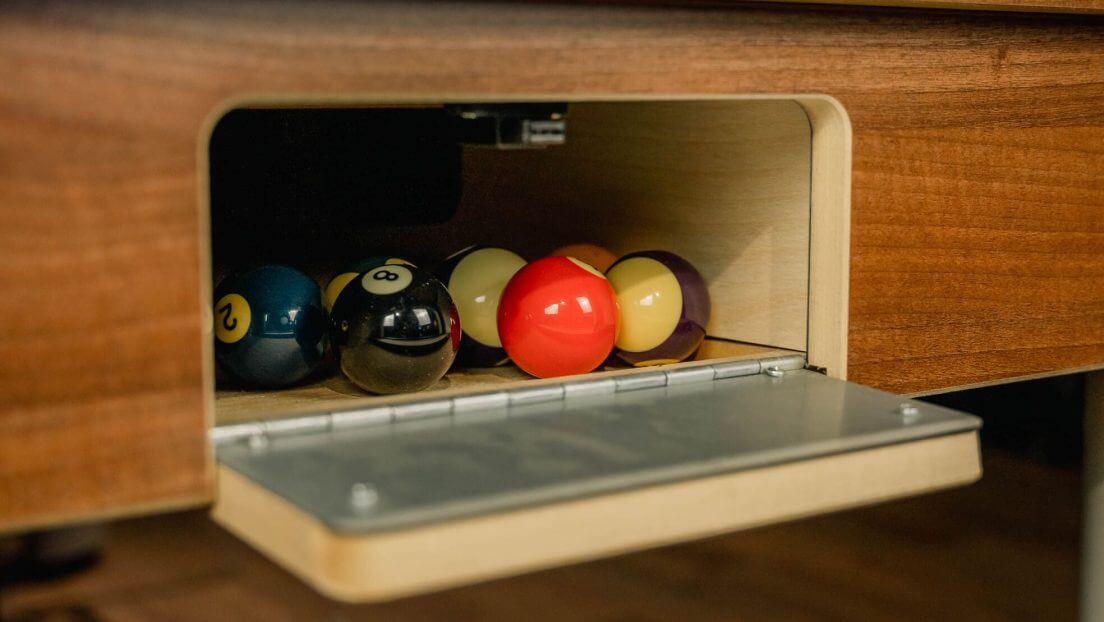 The Essex is equipped with a convenient ball return system, which also serves as a temporary ball storage area when the table is not in use. Additionally, the table has a concealed dropdown ball door.