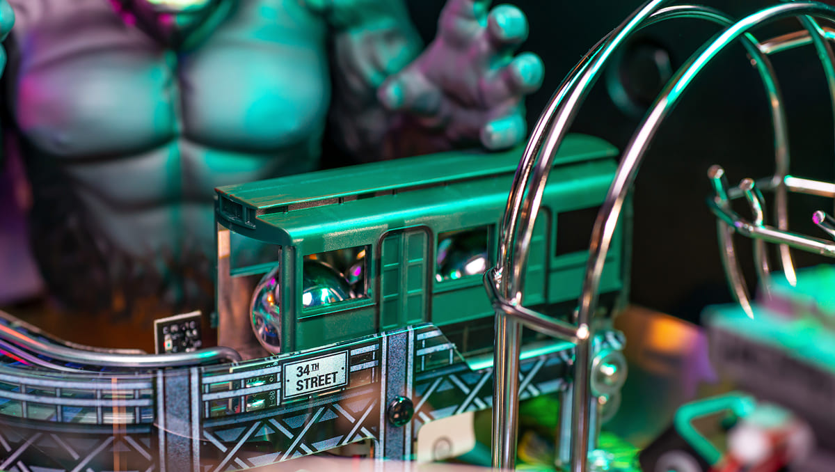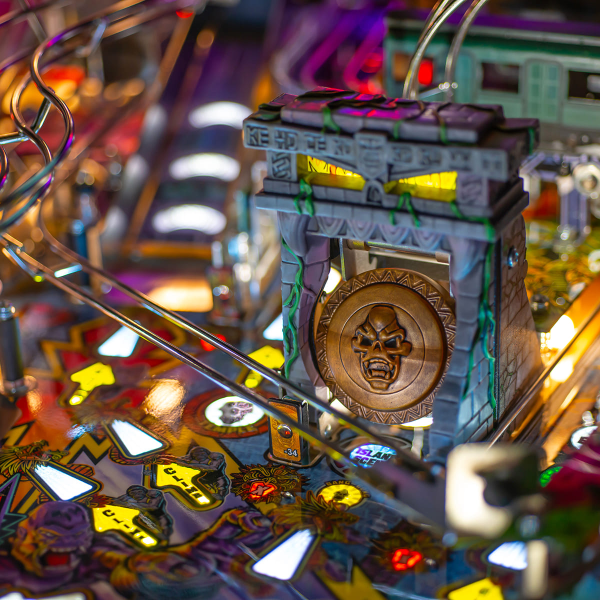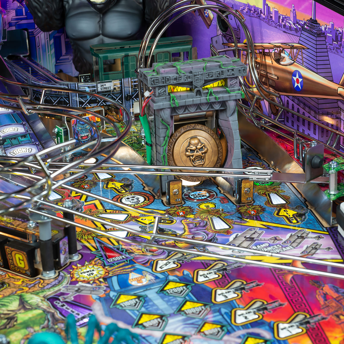 A motorized NYC train car locks balls and flips open when Kong unleashes multi-ball chaos — a cinematic centerpiece in Premium and LE models. It’s one of the most kinetic mechanisms ever built into a Stern game. The Pro model offers the same gameplay logic using a simplified version.
