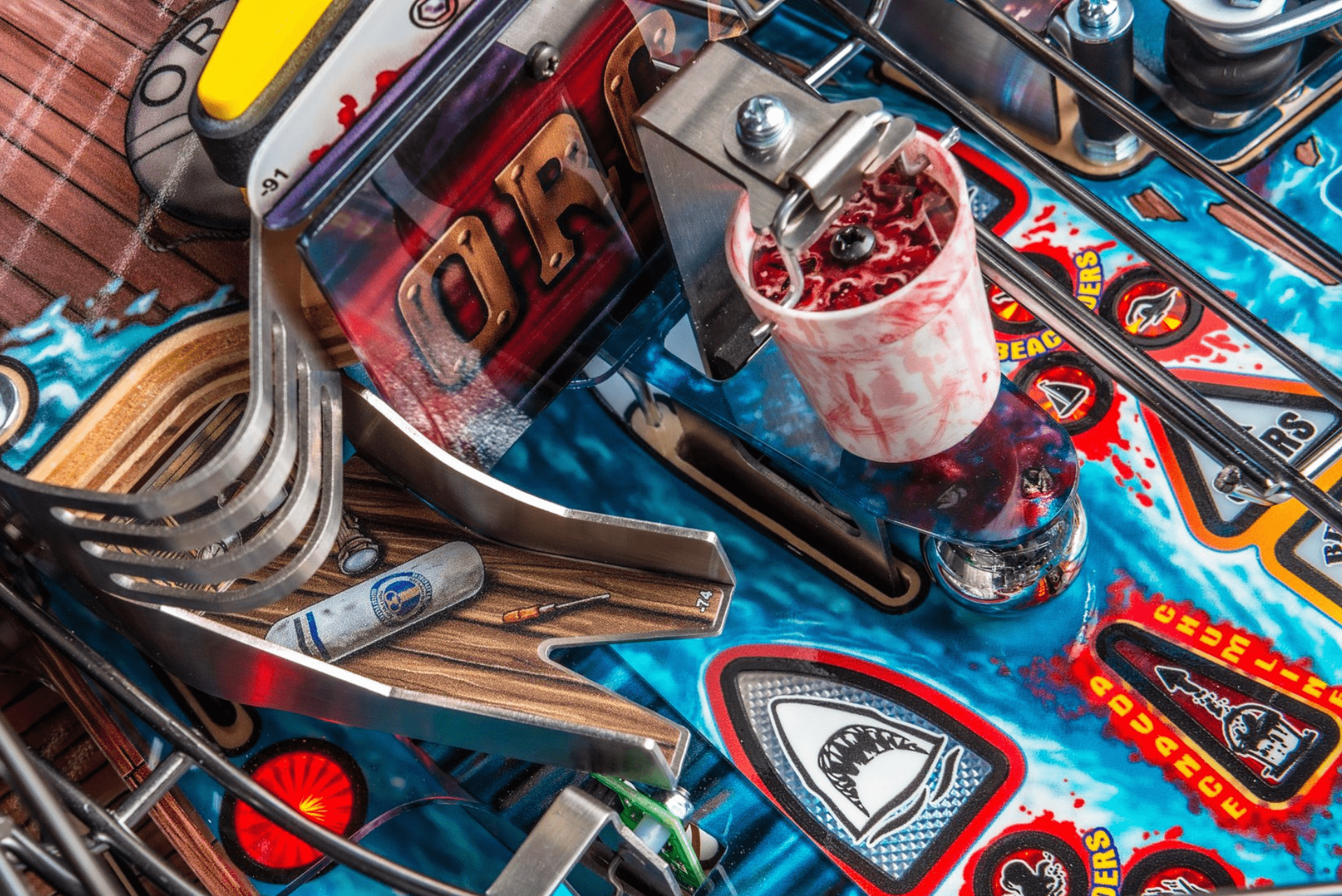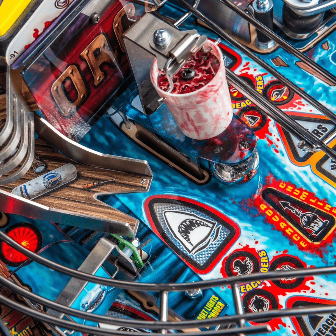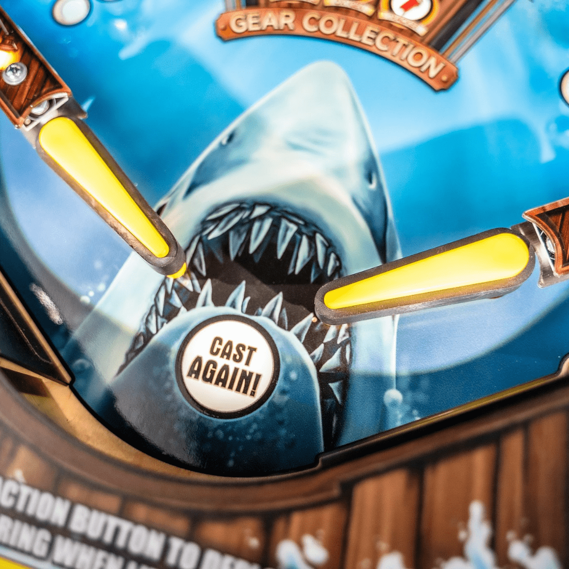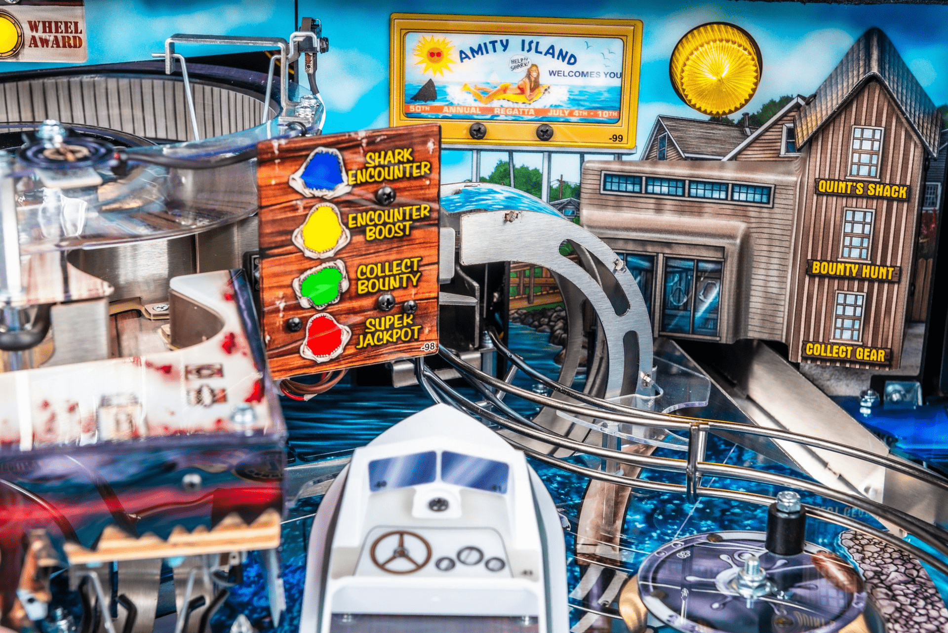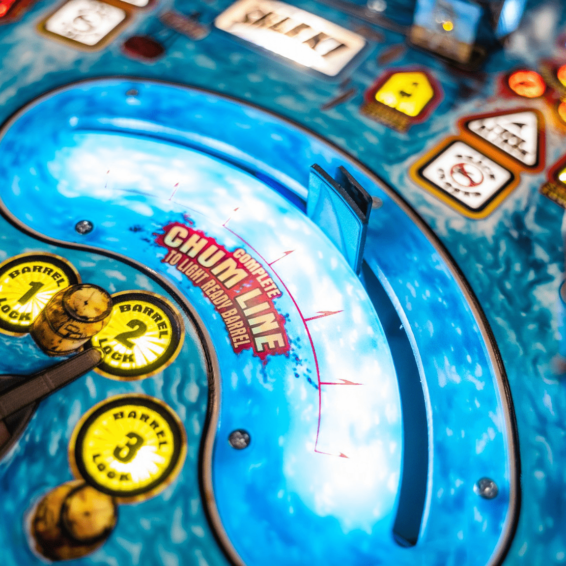 The Chum Bucket feature activates a physical bucket mechanism that releases simulated chum onto the playfield, adding a visceral element to gameplay. This, coupled with the Blood in the Water effect, triggers visual and auditory cues signaling the approach of the Great White Shark, intensifying suspense and immersing players in the thrill of the hunt as they navigate through dynamic challenges and objectives.