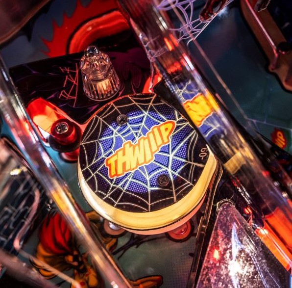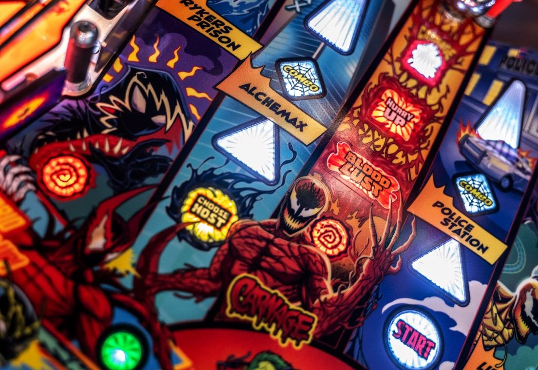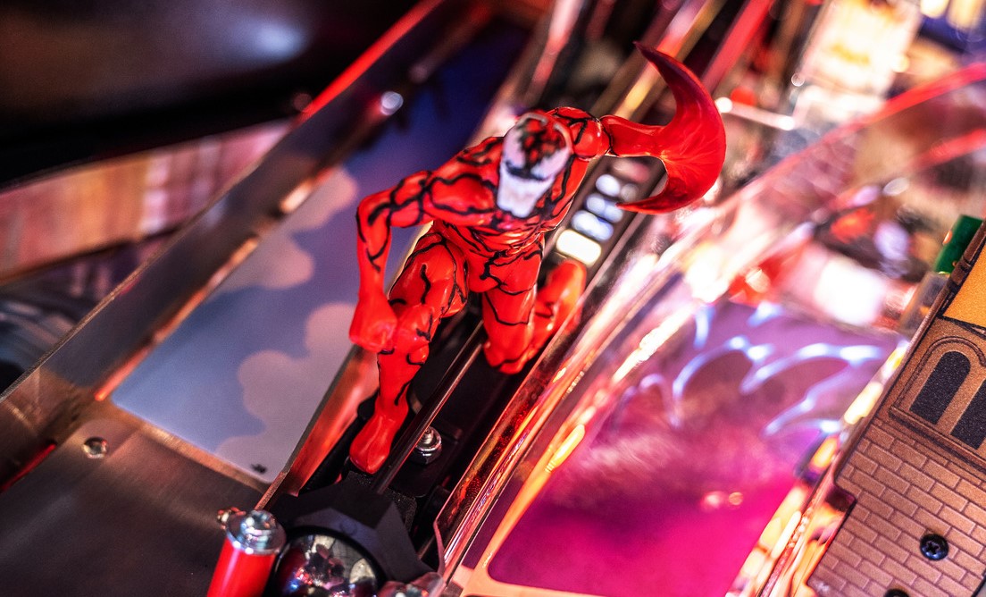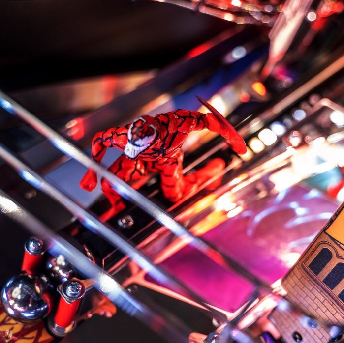 As you play, the Carnage Bash Toy comes into play, demanding your full attention and skill. The malevolent symbiote adversary will test your pinball prowess, responding dynamically to your shots and keeping you on your toes with its unpredictable movements. This Carnage Bash Toy is not just a static element on the playfield; it reacts to your every shot, each hit will send Carnage into a frenzy, pushing the limits of the pinball machine’s mechanics.