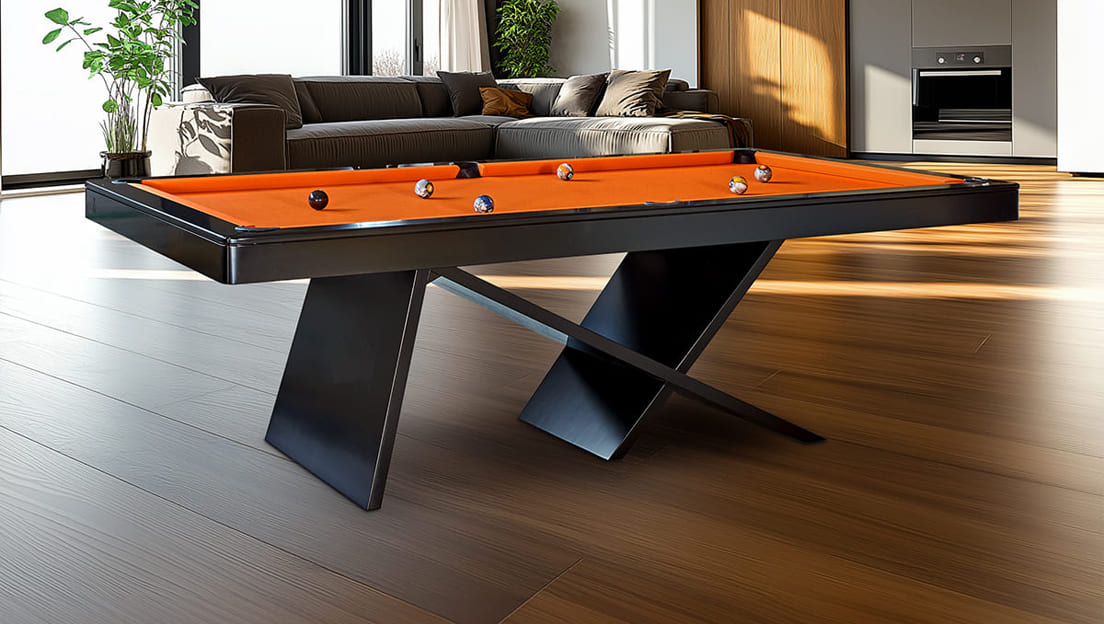 The Vision Kyx is built for those who want a sleek, space-saving pool table that doubles as a dining or work surface. With its distinctive crossbar-reinforced structure, it offers outstanding stability and comfort while maintaining a refined, modern look. Here’s what makes it stand out: